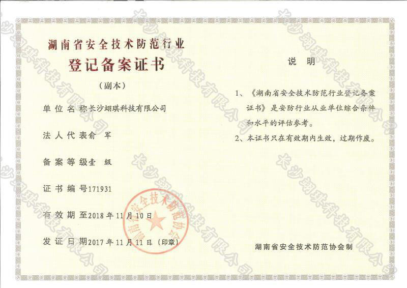 安全技術(shù)防范行業(yè)登記備案證書
